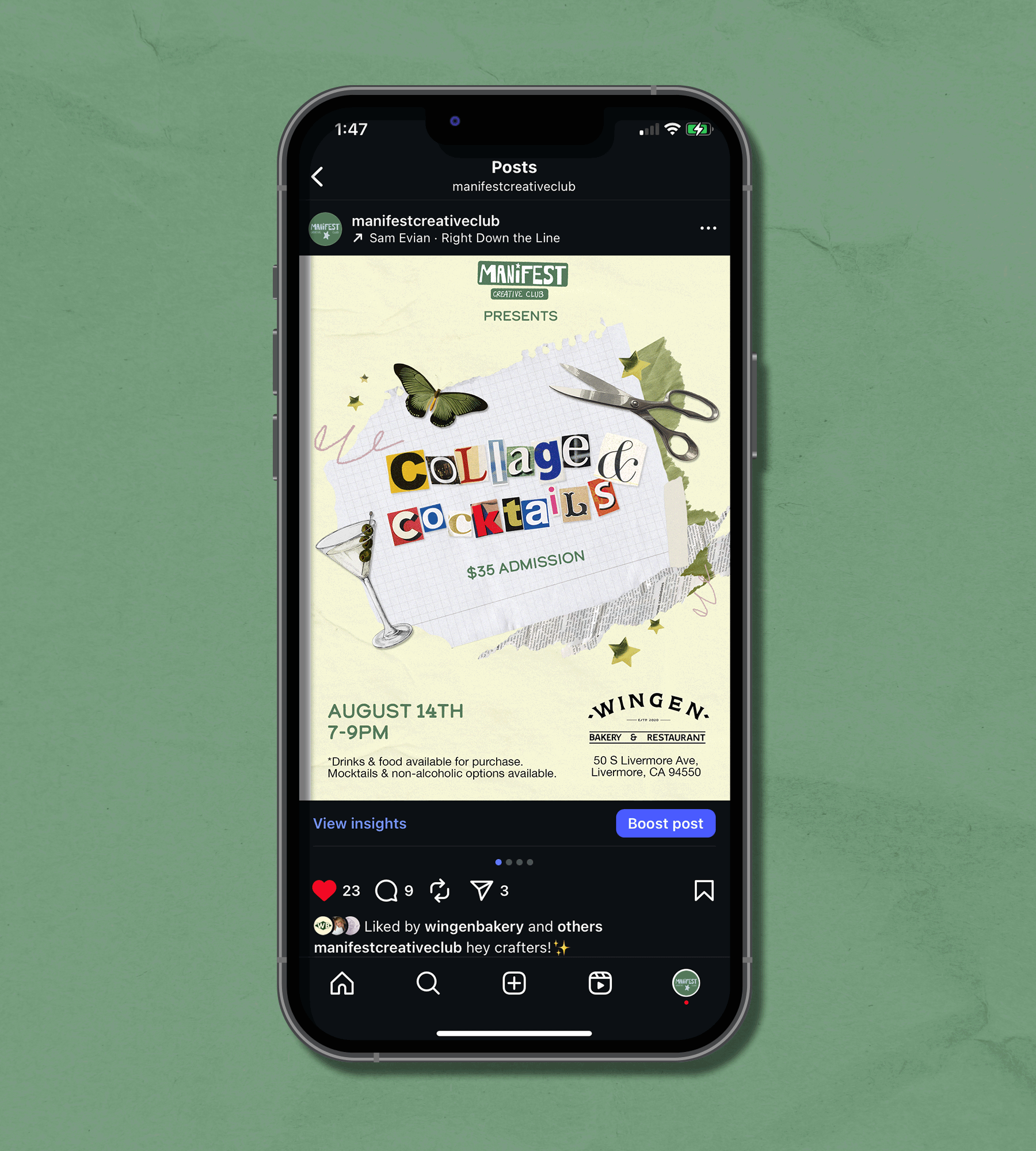Manifest Creative Club is a crafty events service that hosts art-focused community events in the San Francisco Bay Area. Their main goal is to encourage connection and self-care through creativity while also supporting local businesses and charitable causes.
